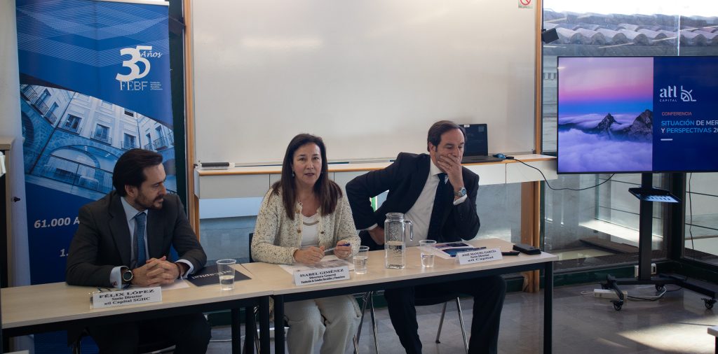 Pie de foto: De izda a dcha Felix López, socio director de atl capital SGIIC, Isabel Giménez, directora general FEBF y José Manuel García, socio director de atl capital grandes patrimonios, en la sede de la FEBF